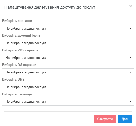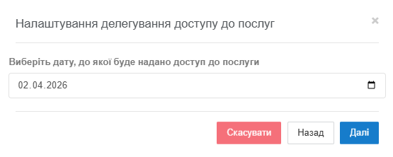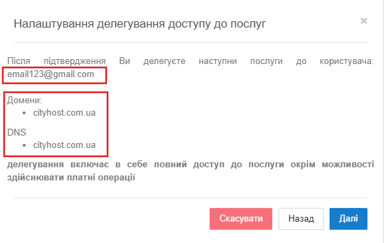 Примечание: Доступ аннулируется в выбранную дату в 00:00. Если срок делегирования длиннее срока оплаты услуги, доступ закроется автоматически в момент удаления услуги.