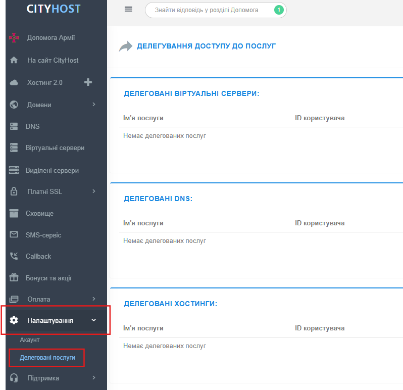 Выберите пункт меню НАСТРОЙКИ — Делегированные услуги